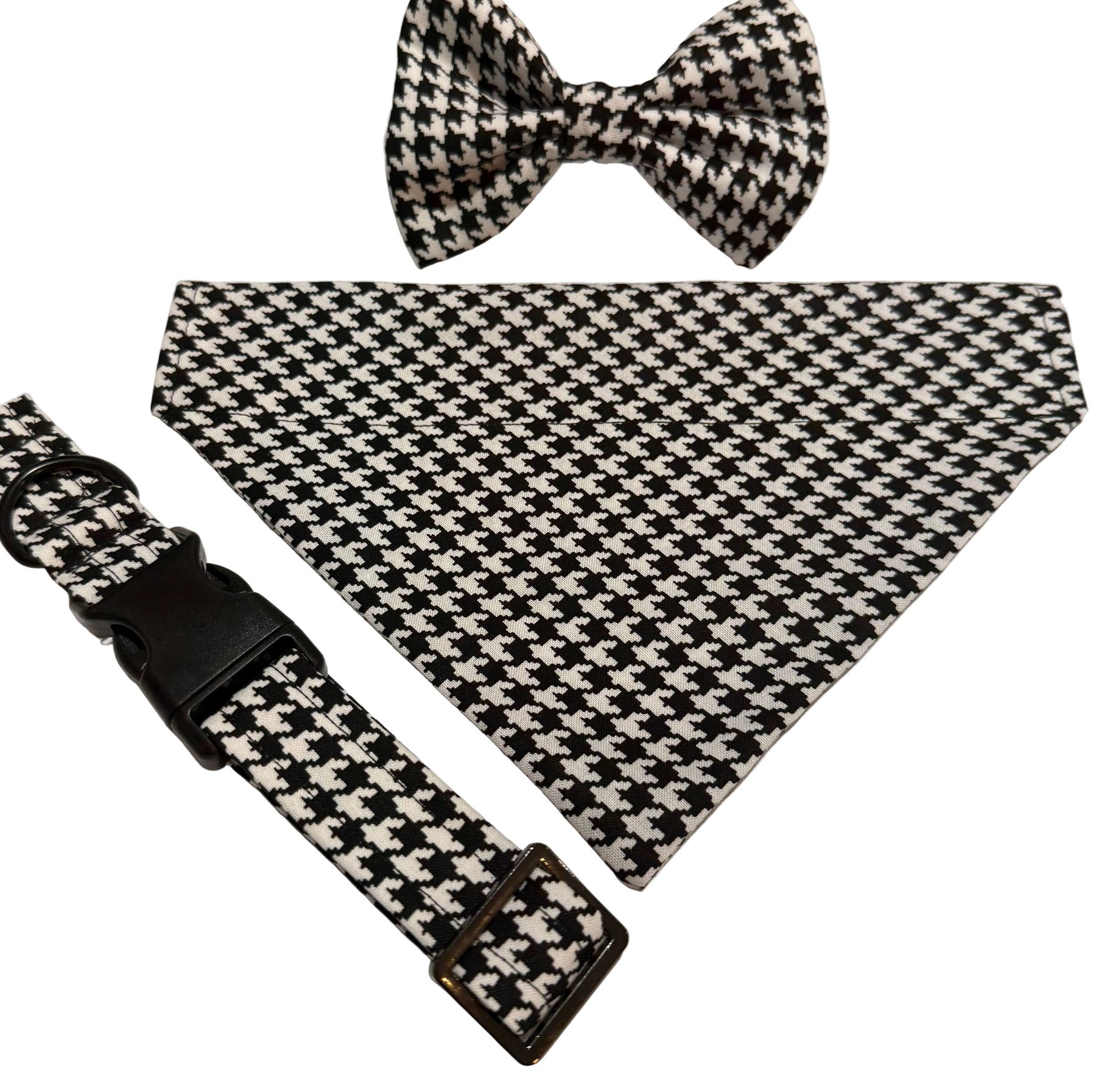 This versatile houndstooth collection brings timeless style to your dog's wardrobe. The classic black and white pattern coordinates seamlessly across four coordinating pieces: a bandana for casual charm, a structured collar for everyday wear, an elegant bowtie for special occasions, and a matching wristlet bag for the fashion-forward pet parent. Each piece features quality construction and the iconic houndstooth design, allowing you to mix and match for endless styling possibilities. Perfect for photo shoots, outings, or simply elevating your pup's everyday look with sophisticated flair.
