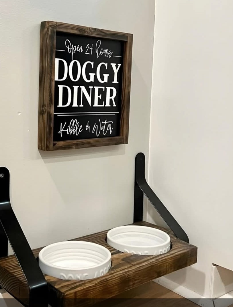 Professionally crafted Doggy Diner Sign perfect for designating your pet's feeding area. Features "Open 24 Hours" text with "Kibble and Water" menu indicators. Versatile display options allow for wall mounting or shelf placement, enhancing your home's pet-friendly décor while adding functional organization to feeding routines.
