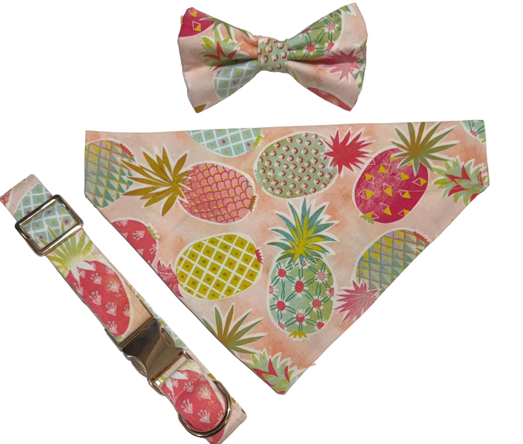 Brighten your pup's style with this cheerful pineapple bandana. Perfect for adding a tropical flair to any dog's wardrobe, this vibrant accessory features playful pineapple prints that'll have everyone smiling. Easy to tie or slip on, it's ideal for everyday wear, photo shoots, or special occasions. Keep your furry friend looking fresh and fashionable all season long.